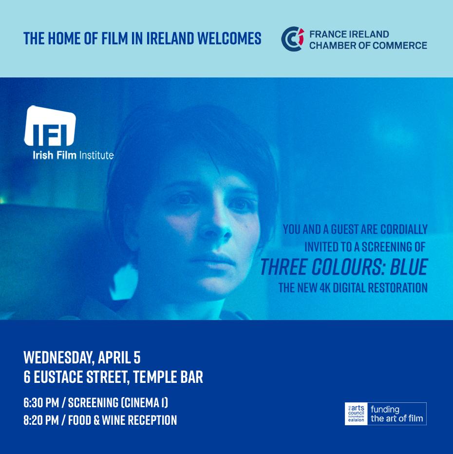 We are delighted that our friends at the IFI are hosting a special evening for France Ireland Chamber of Commerce members around the Wednesday, April 5th, 6:30pm public screening of the first film in the trilogy, Blue. The IFI will also host us for a private food and drinks immediately after the screening. Click here for a brief film synopsis.