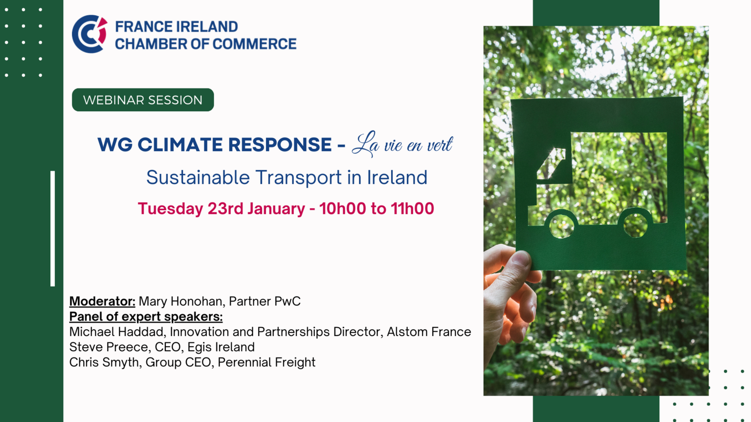 As part of a series of webinars under “WG Climate Response – la vie en vert”, this webinar focuses on sustainable transport in Ireland.