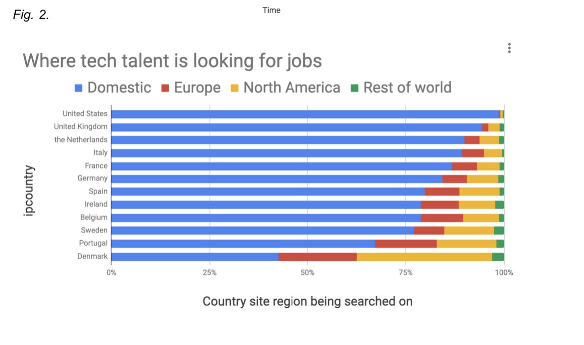 The research examined data across twelve countries to show trends in the tech labour market from 2017 to 2019. By looking at searches such as ‘software engineer’, ‘programmer’ and ‘web developer’ the research showed what countries are most popular for cross-border or domestic searches.